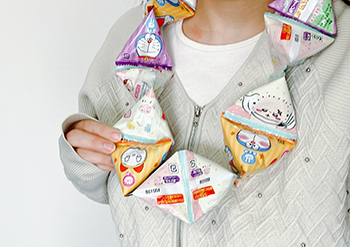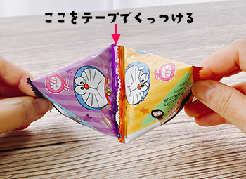 作り方は超簡単。テトラタイプのお菓子の端と端をセロテープで貼りつけるだけ!
