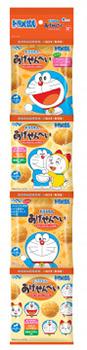 食べ切りサイズが4つつながった、便利な連包タイプのあげせんべいです。甘じょっぱい醤油だれの香ばしさが口いっぱいに広がり、ポリポリとした食感が止まらなくなる美味しさ。パッケージには色々な表情のドラえもんが描かれていて、選ぶのも楽しみの一つです。コンビニやスーパーで買えるので、映画を観た後、公園などでみんなで小分けにしてシェアするのにも大変重宝します。
