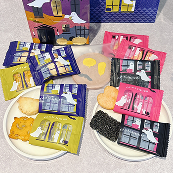 「ハロウィンハウス」は、その名の通り、家の形をしたボックスに入ったおかきセット。小さな家の屋根から中を覗くと、オレンジや紫に彩られたハロウィーン柄の個包装が並んでいて、見ているだけでワクワクします。