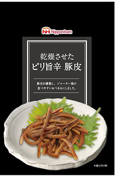 これまで加工実績のなかった豚皮を原料に、お酒に合うピリ旨辛のジャーキー風おつまみにしました。