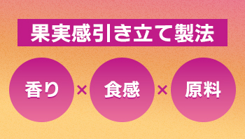 次に注目したのが食感で、ハードな食感でも果実感が広がるように絶妙なバランスにこだわっています。更に果実の味わいを最大限引き出すために、フレーバーごとに雑味のないゼラチンを掛け合わせています。