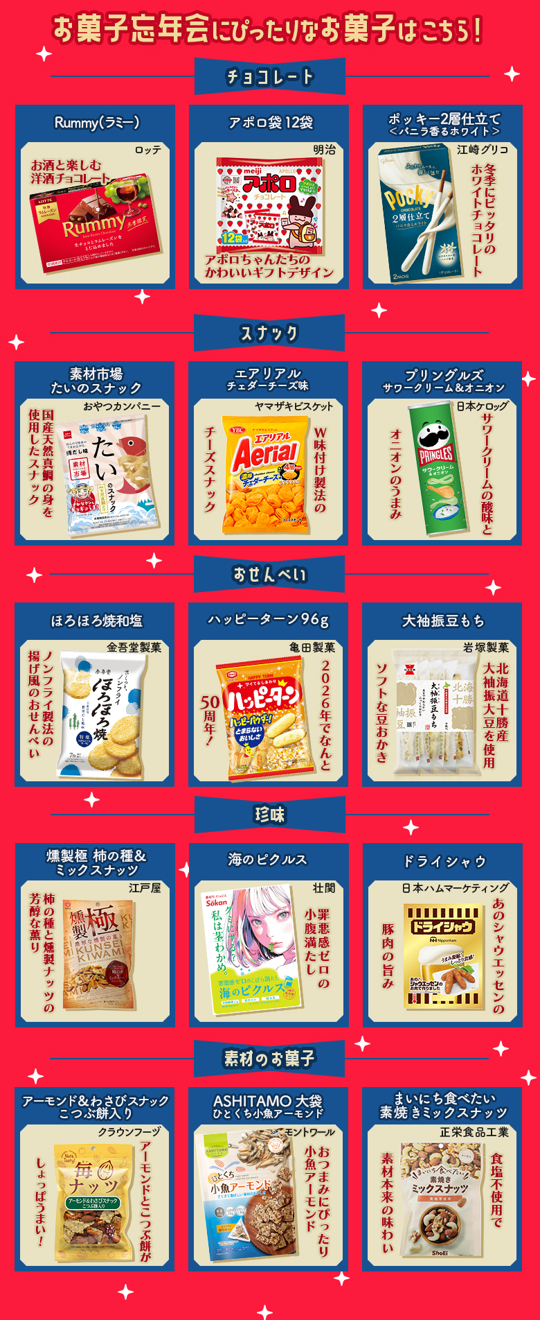 2025.12.01 【プレゼントキャンペーン】お菓子忘年会で年末年始を楽しもう!(プレゼントあり) ご褒美 キャンペーン この記事を書いたライター お菓子と、わたし 編集部 ライターのプロフィールを見る 【開封レポ】ぱくっと!お菓子実食レポ🍪vol.30~ぷちきゅあマスコット2を開封してみた~ 記事一覧へ 【ご自愛お菓子ラボ】のどをケアしたい時に♪おすすめのお菓子♡ あなたにおすすめのお菓子記事 NEW 2025.12.01 【プレゼントキャンペーン】お菓子忘年会で年末年始を楽しもう!(プレゼントあり) 2025.11.27 【プレゼントキャンペーン】ごぼうのチョコレート?!<ゴボーチェ>にインタビュー!(プレゼントあり) 2025.11.25 【実食レポ】ぱくっと!お菓子実食レポ🍪vol.32~冬やクリスマス気分に浸れる白いお菓子特集❄~ 2025.11.25 【プレゼントあり】ブラックフライデーにおすすめの黒いスナック菓子をご紹介♬ 2025.11.20 【プレゼントキャンペーン】日本ハムが作る本格的なおつまみシリーズにインタビュー!(プレゼントあり) 2025.11.13 【プレゼントキャンペーン】創立120周年!ライオン菓子さんの「きえちゃうキャンディー」にインタビュー!