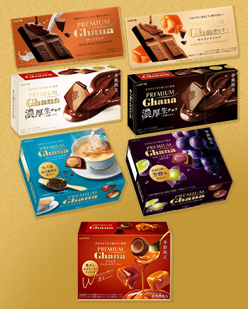 プレミアムガーナは大きく分けて4種類あり、上品な味わいの板チョコ型「プレミアムガーナ」をはじめ、生チョコレートをガーナで包んだ、カード型の「濃厚生チョコレート」、とろりととしたソースが溢れる「ショコラ」、贅沢にほおばる「大粒トリュフ」があります。