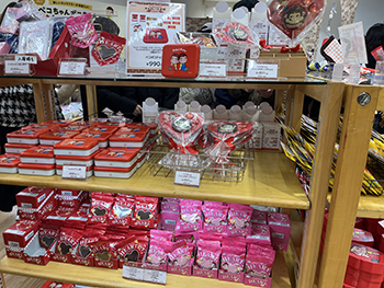 他にもペコちゃんやミルキーのイラストが入った限定デザインの数量限定シューズや、バレンタインのギフトにぴったりなチョコが並び、ついついいろんなグッズを見てしまいます♡