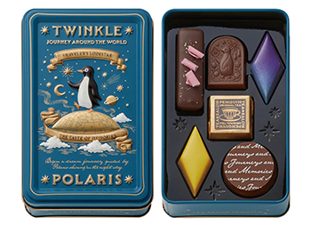 どこか懐かしい「喫茶店」の世界観をペンギンたちと共に楽しむシリーズ。夜空をイメージした美しい缶は、食べた後も小物入れとして使いたくなります。スーパーの季節菓子売場で見かけたら即買い推奨!ペンギンが旅をするロマンチックなデザインは、2026年のトレンドであるレトロ可愛い雰囲気にぴったりです。