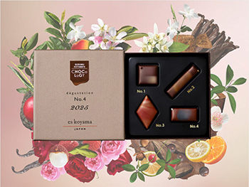森の奥行きを思わせる「イスバラヤ」、タヒチバニラが際立つ「ティオタ」、バラの香りをショコラで表現した「マナカラ」、レザーのような深みを描いた「キュイール」の4種の詰め合わせです。