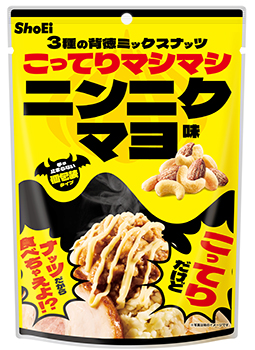 アーモンド、カシューナッツ、ピーナッツの3種に、生ニンニクの強烈な香りとマヨネーズの酸味を絡めた、中毒性抜群の「こってり味」です。ガッツリ系ラーメンをイメージしたパンチのある風味は、お酒との相性も最高。ついつい手が伸びてしまう背徳的な美味しさを、お近くのスーパーやコンビニで体験してください。