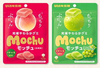 お口の中でぷにゅ~っと溶けていく独特の食感で好評を頂いており、現在「モッチュ 白桃味」「モッチュ シャインマスカット味」の2種類を発売しています。