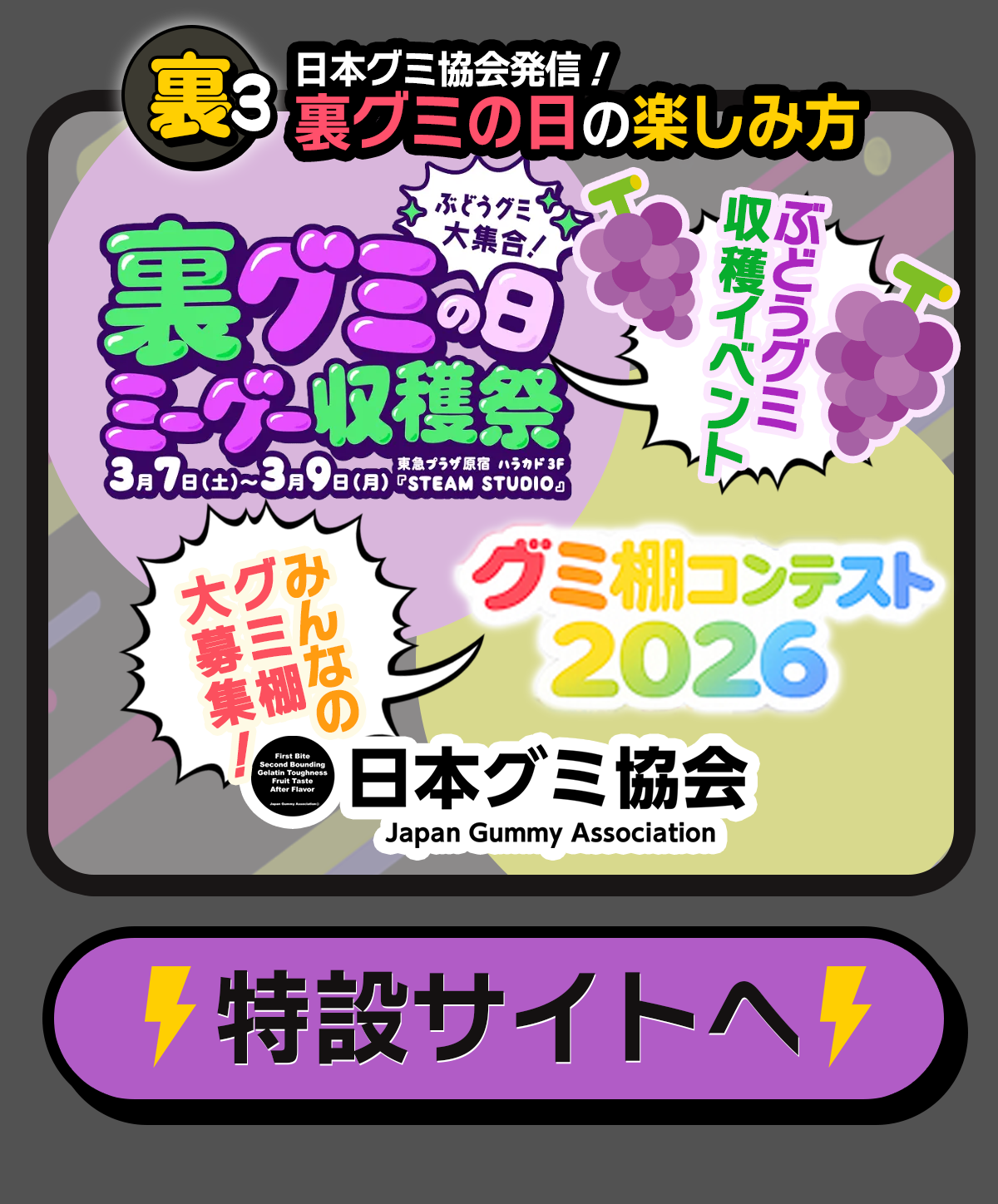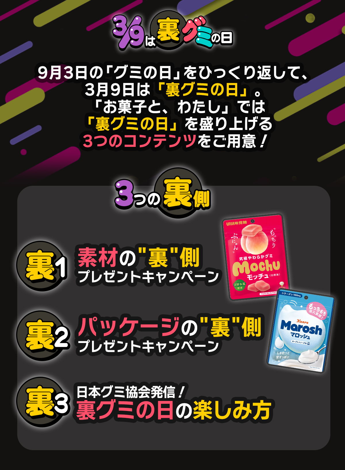 2026.02.26 【3/9は裏グミの日】グミを楽しむキャンペーン開催中!(プレゼントあり) この記事を書いたライター お菓子と、わたし 編集部 ライターのプロフィールを見る 【3/9は裏グミの日】素材の裏側にインタビュー!(プレゼントあり) 記事一覧へ 【3/9は裏グミの日】「マロッシュ」パッケージの裏側にインタビュー!(プレゼントあり)