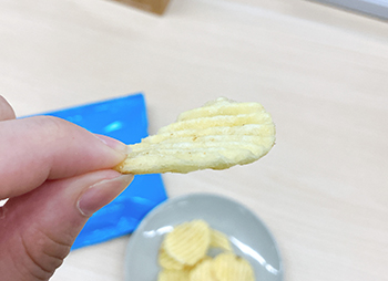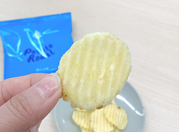 中身のスナックは分厚くカットされていて、噛むと厚みのあるじゃがいもの、ほくほくとした芋感があります。