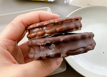 そして「生エンゼルパイ」。断面を切るとホロホロとしたビスケットがおいしそうです!チョコも分厚いですね。